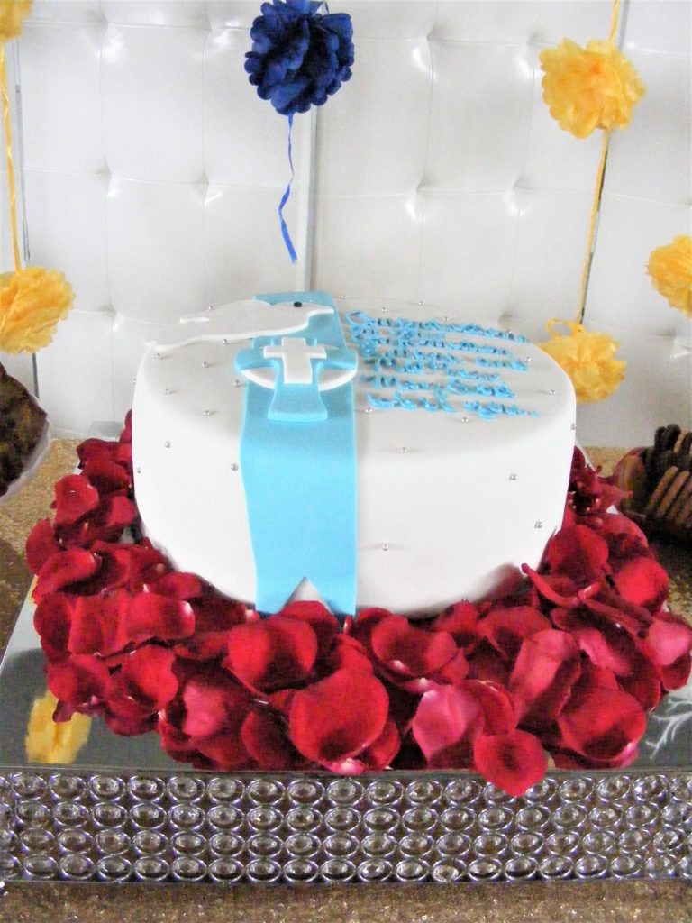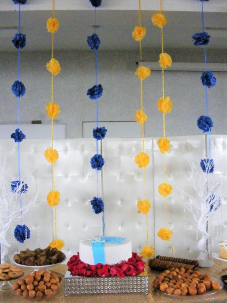 Gold vases were selected; in two different sizes for the confirmation flowers and decor. For the centerpiece, we used paper flowers and fresh flowers on the table. On the buffet, tables we created four large fresh flower arrangements to compliment the event. We chose a luxurious satin blue table cloth to cover the round guest tables for the confirmation event.
