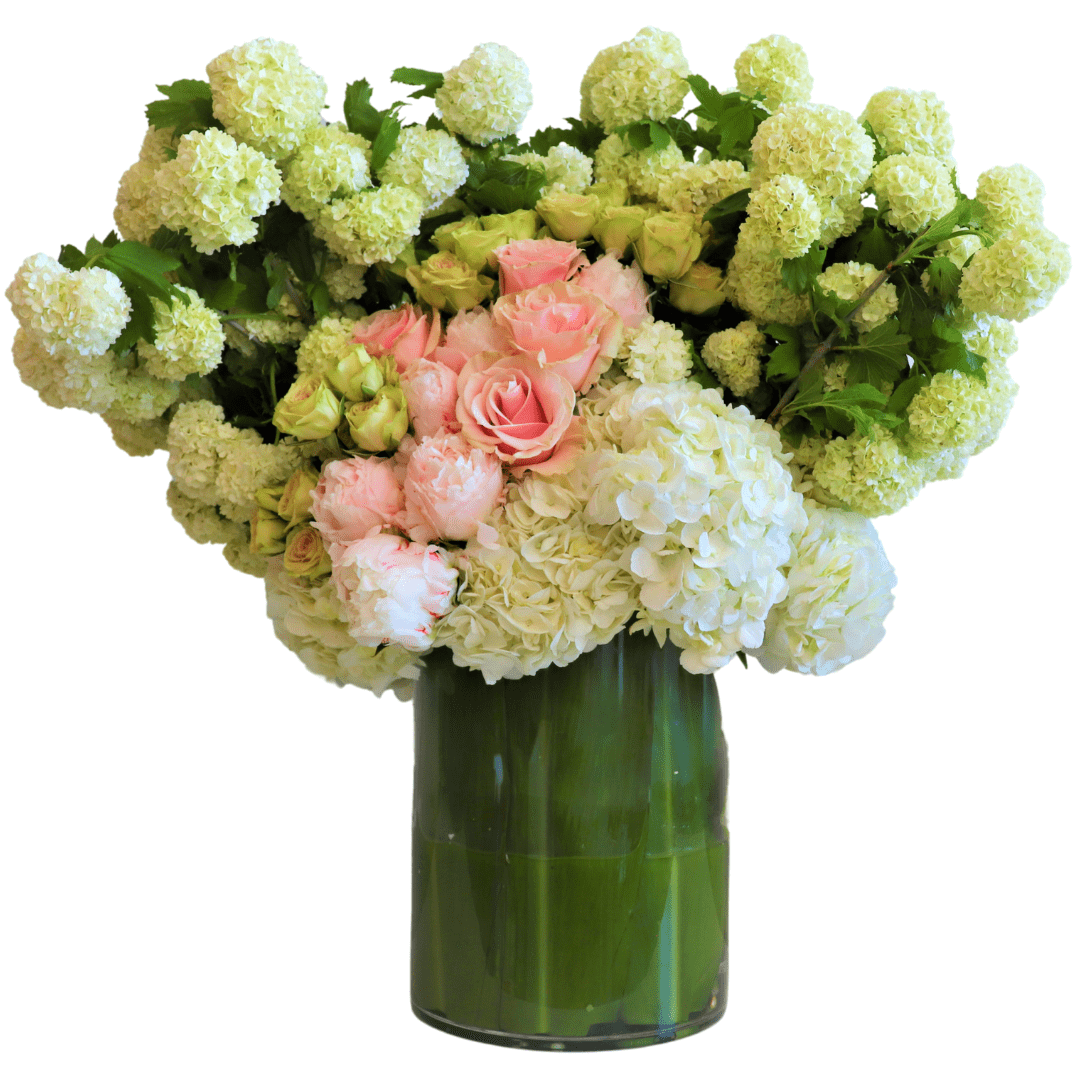 This beautiful, luxurious vase arrangement is designed with hydrangeas, roses, peonies, and viburnums. Extra-large pictured.