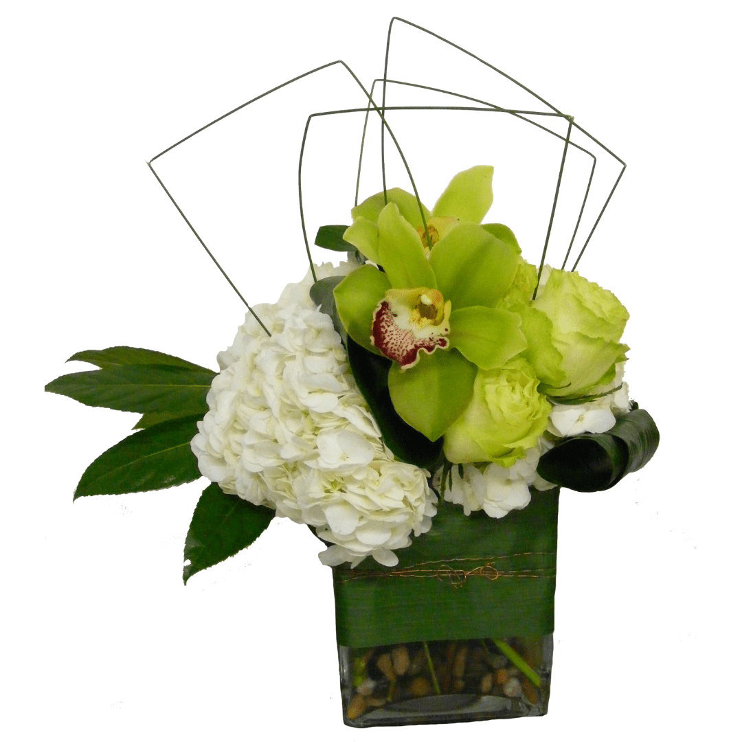 Beautiful modern vase display designed with Hydrangeas, Orchids and Roses. Small pictured.