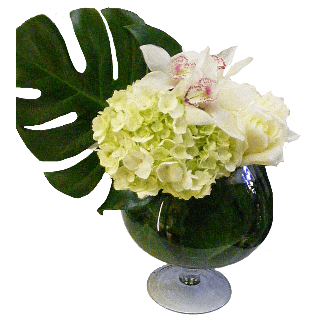 Beautiful modern vase display designed with Hydrangeas, Orchids and Roses. Large pictured.
