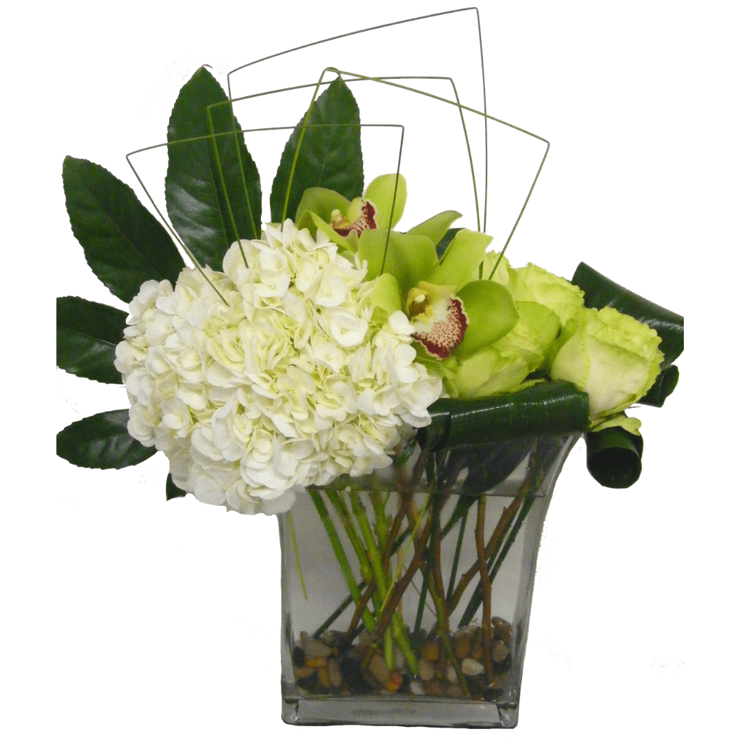 Beautiful modern vase display designed with Hydrangeas, Orchids and Roses. Small pictured.