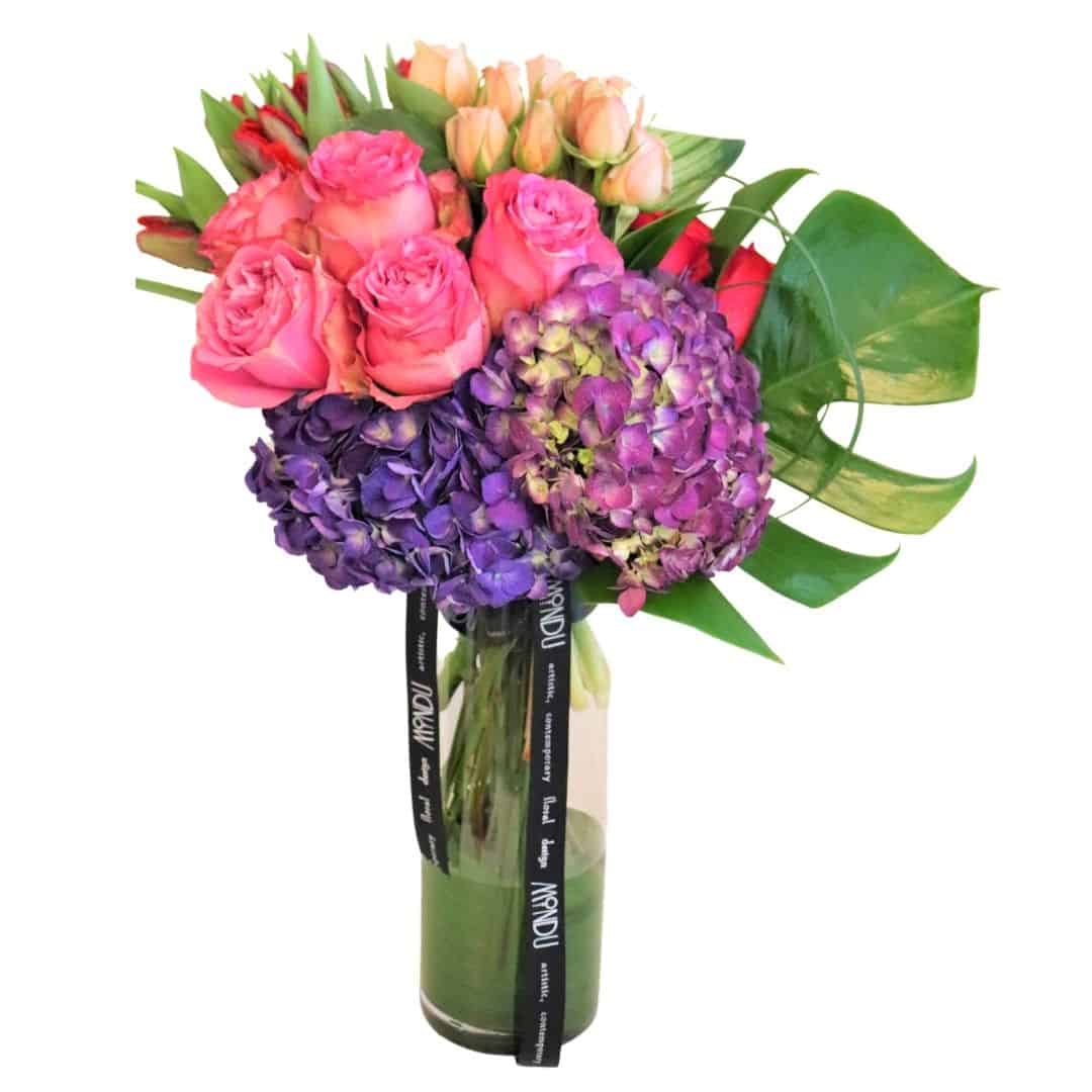 Modern vase arrangement designed with premium roses. spray roses. hydrangeas, tulips, and tropical. Extra-large pictured.