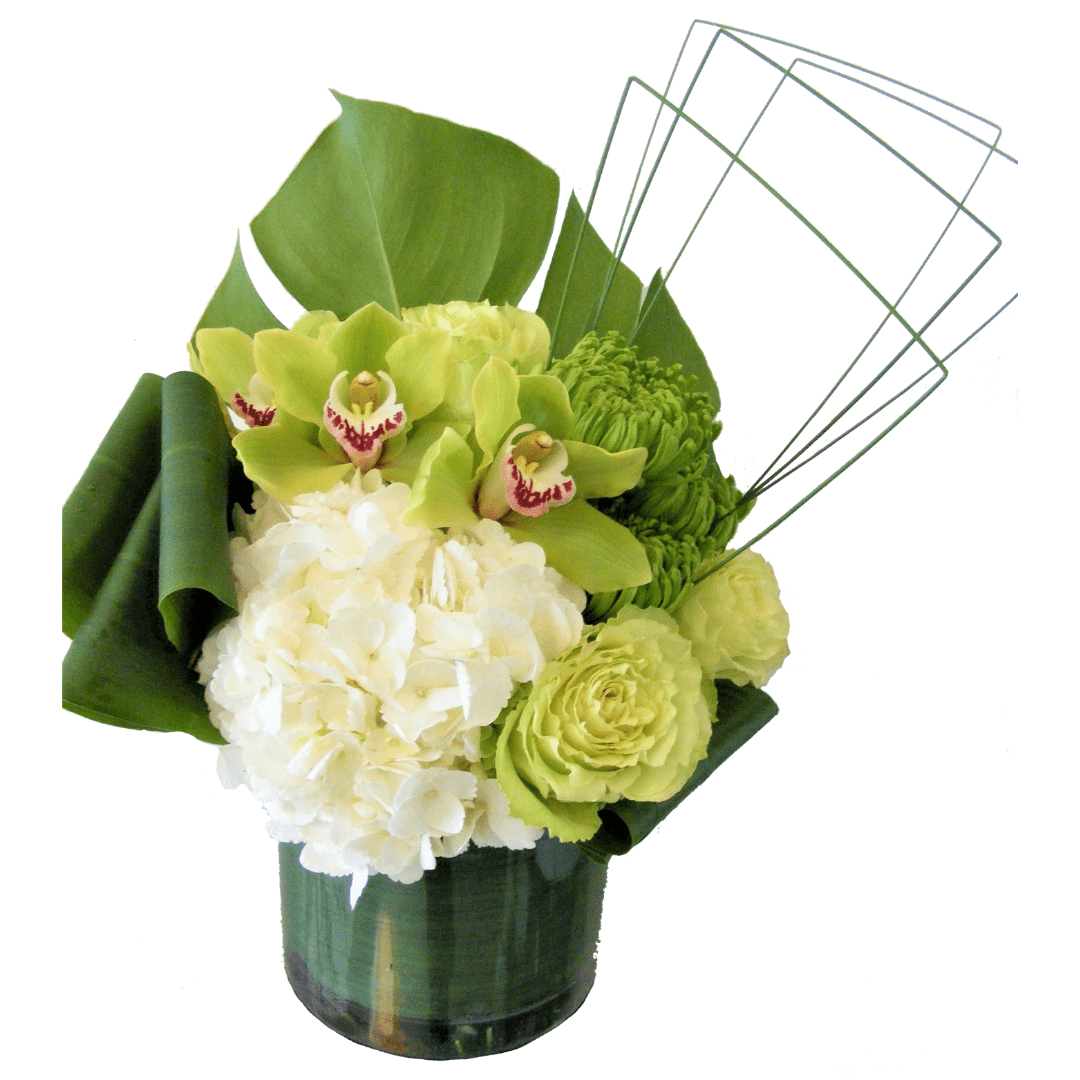 Beautiful modern Vase designed with Hydrangea, Orchids and, Roses. Medium pictured.