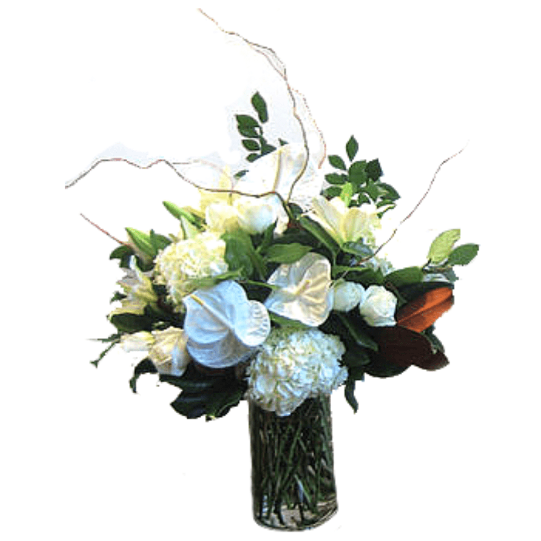Beautiful vase arrangement designed with Hydrangea, Roses, lilies and Anthuriums. Small pictured.