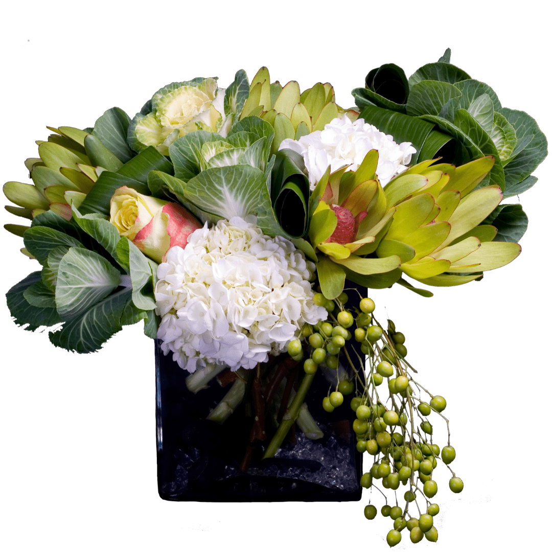 Beautiful vase display designed with Hydrangeas, leucadendron, Berries and Roses. Medium pictured.