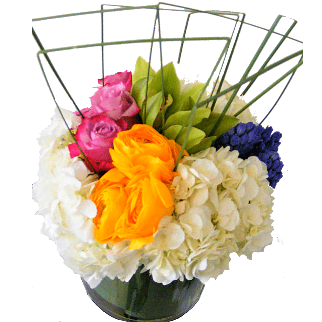 Beautiful modern Vase designed with Hydrangeas, Orchids, and Roses. Small pictured.