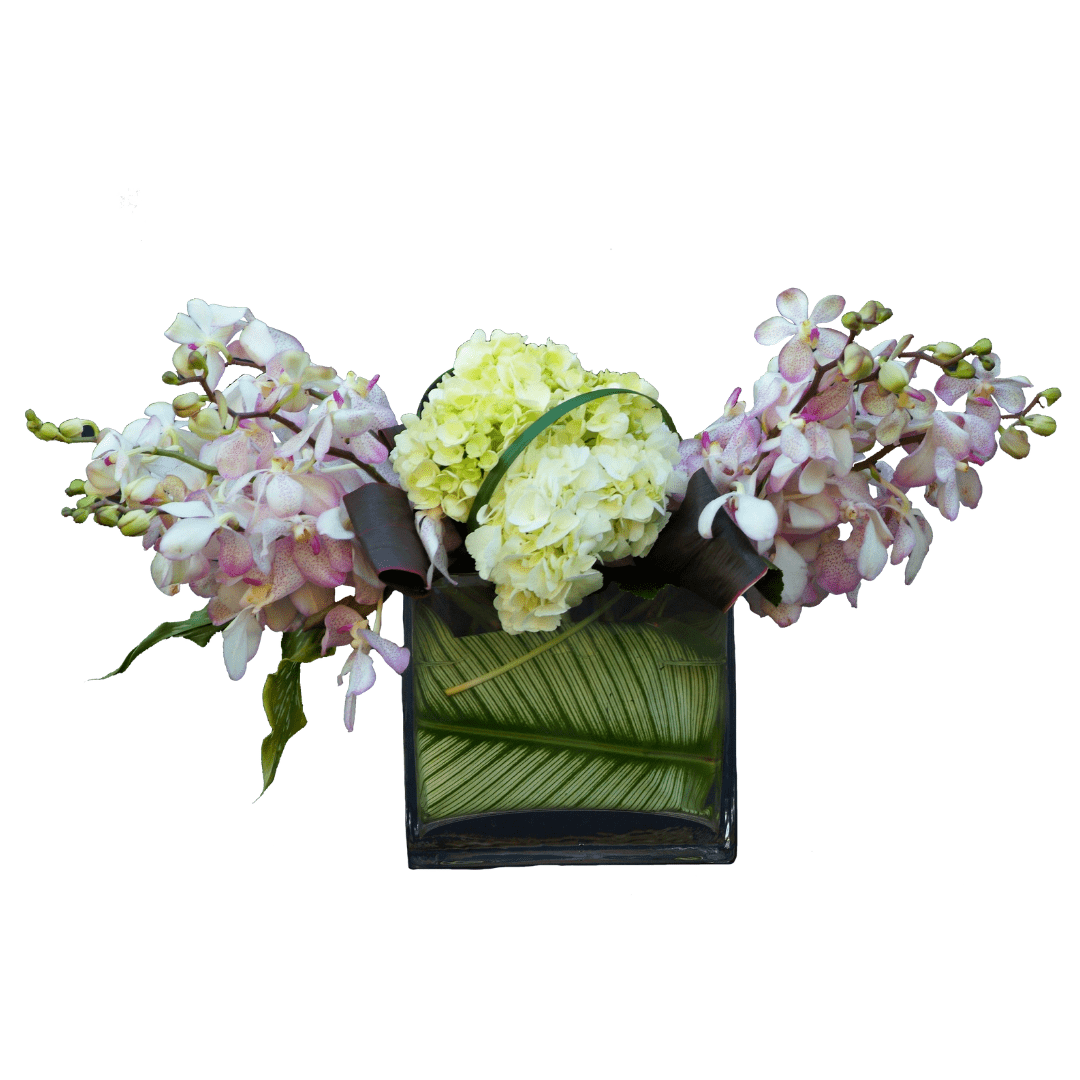 Beautiful modern Vase designed with Hydrangeas and Orchids. Medium pictured.