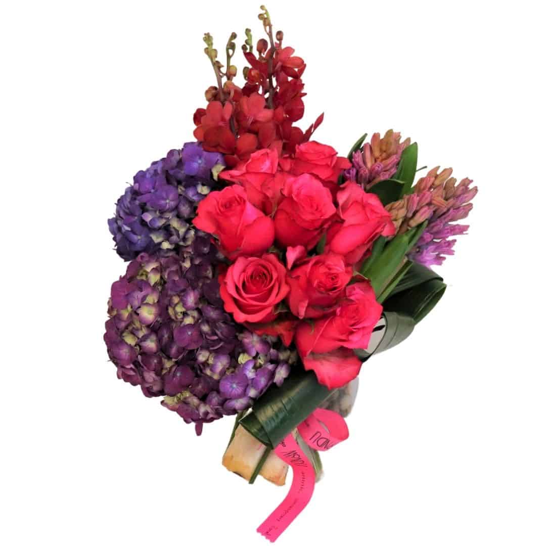 Handtied bouquet designed with premium roses, hydrangeas, hyacinths, orchids, and tropical greens. Medium pictured.