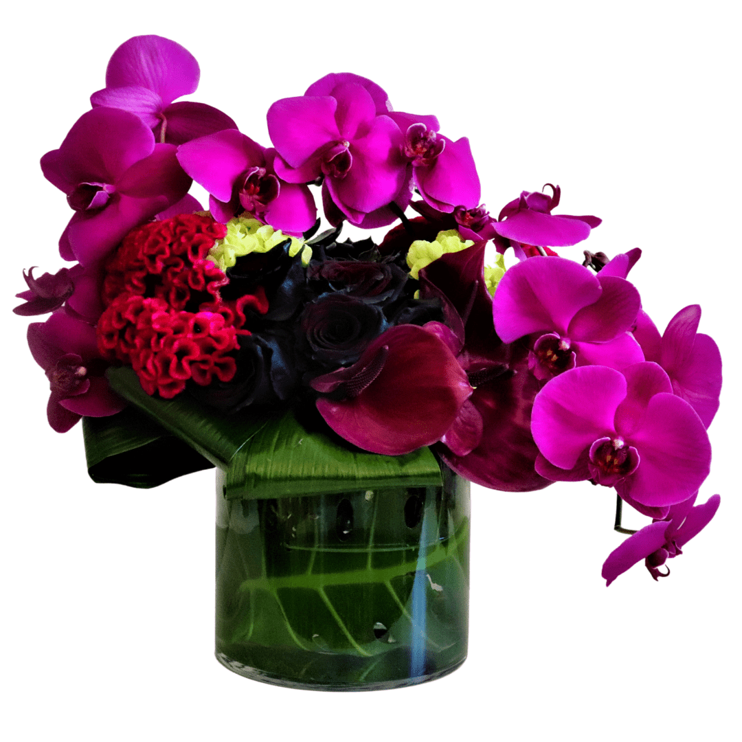 This beautiful modern vase arrangement is designed with orchids, Callas, roses and celosia. Large pictured.