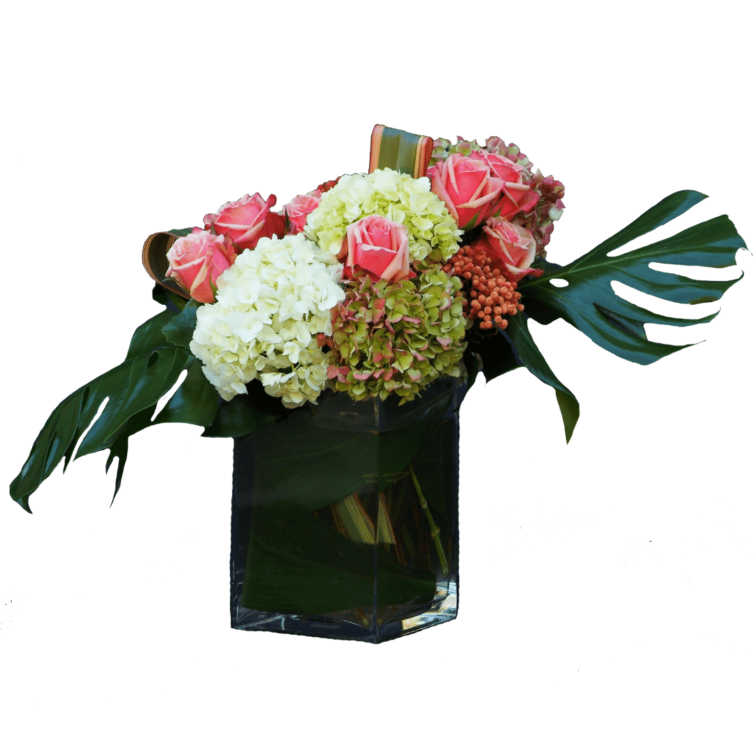 Beautiful modern Vase designed with Hydrangeas and Roses. Large pictured.