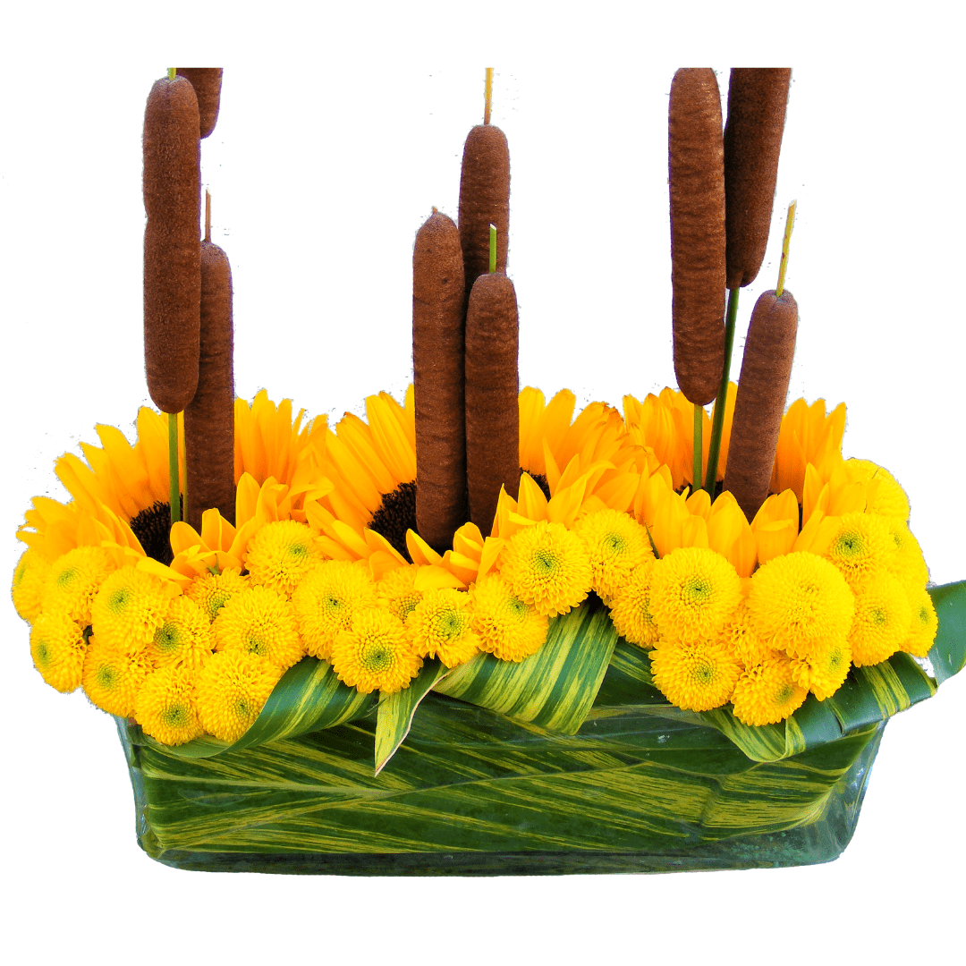 Beautiful modern vase display designed with Sunflowers, Mums and Bullrushes. Small pictured.