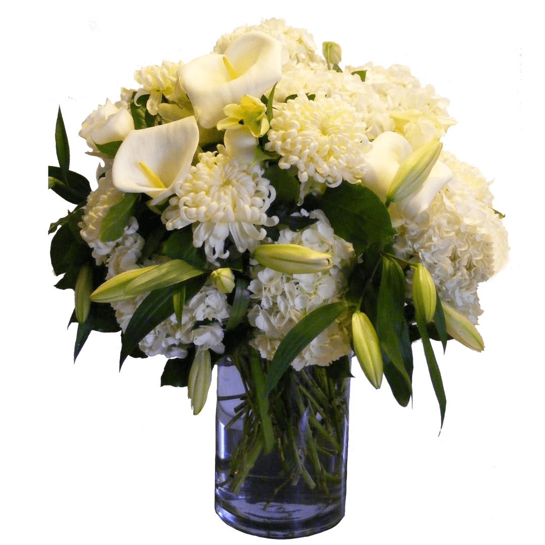 Beautiful vase arrangement designed with Hydrangea, Roses, lilies and Mums. Medium pictured.