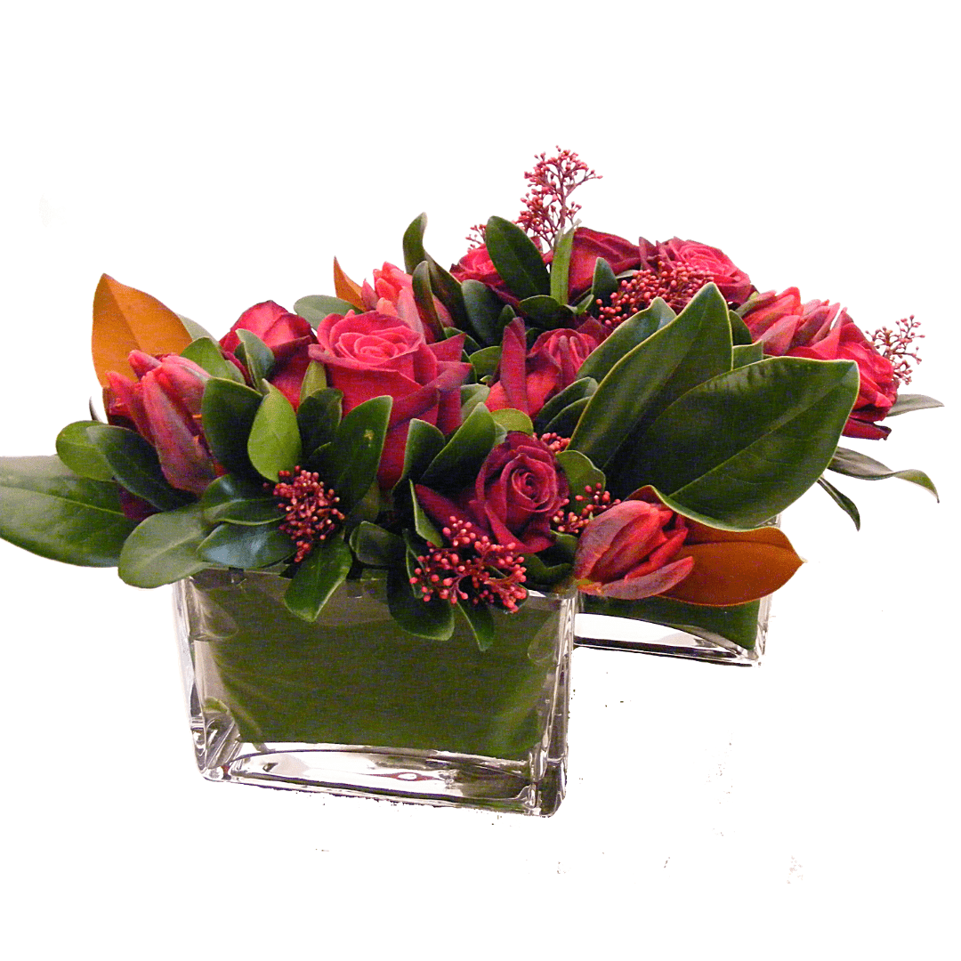 Beautiful modern vase display designed with Skimmia, Tulips and Roses. Large pictured.