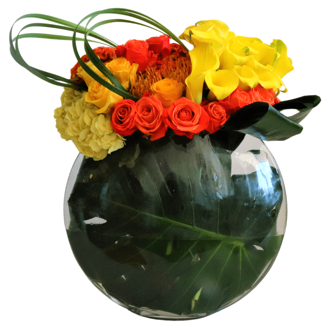 This beautiful compact vase arrangement is designed with Callas, hydrangeas, pincushions, and roses. Extra-large pictured.
