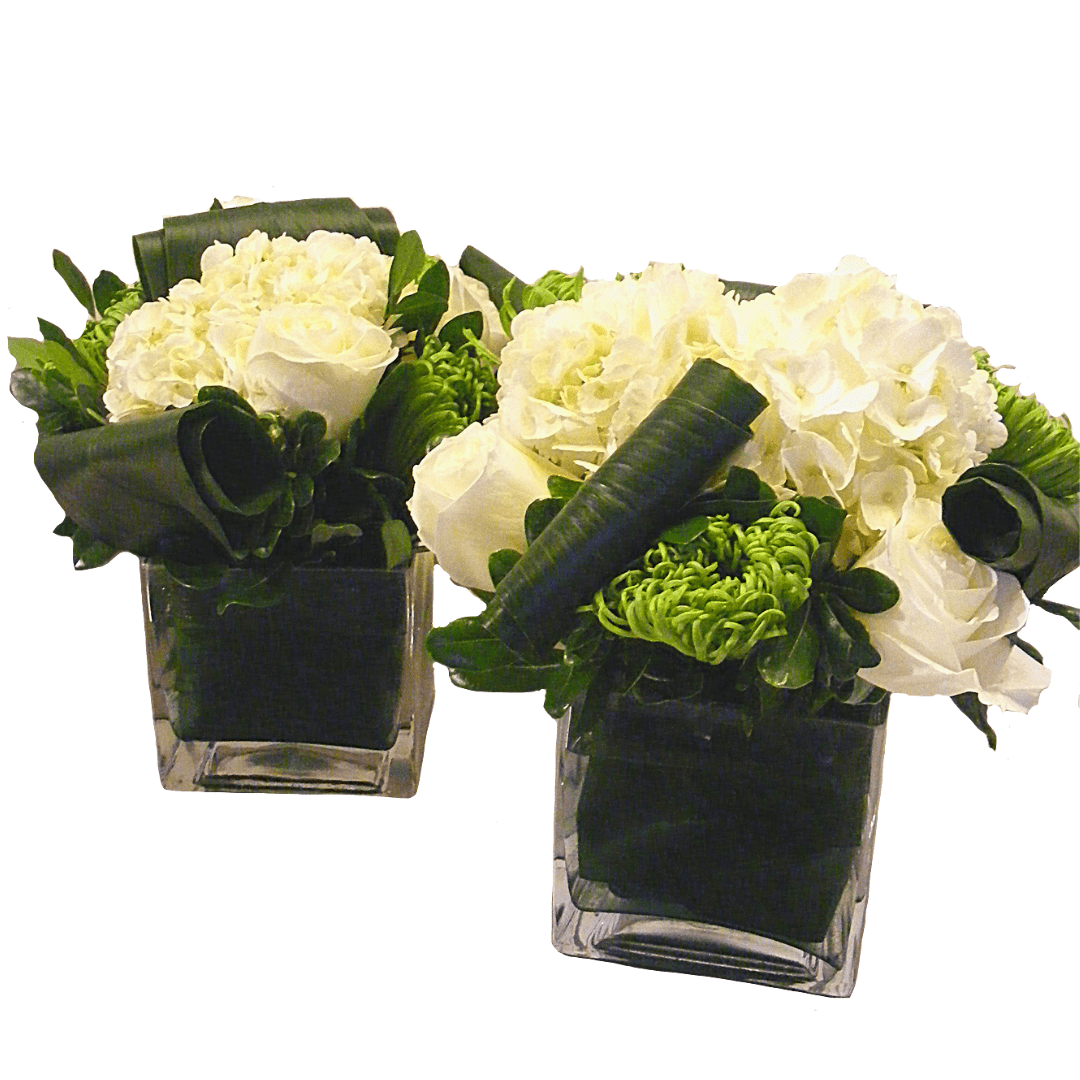 Low square vase arrangement designed with Hydrangeas, Roses and Fugi.