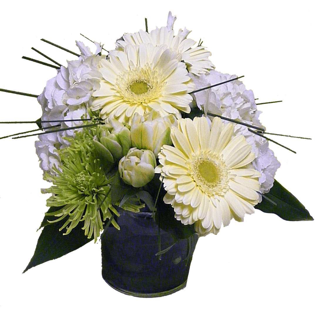 Beautiful modern vase display designed with Hydrangeas, Tulips, Mums and Gerberas. Small pictured.