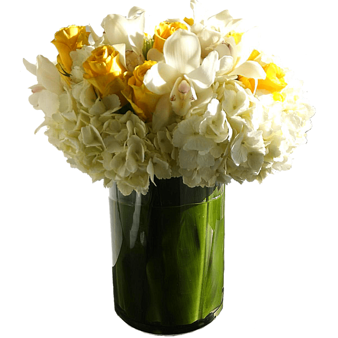 Beautiful modern Vase designed with Hydrangeas, Orchids and Roses. Medium pictured.