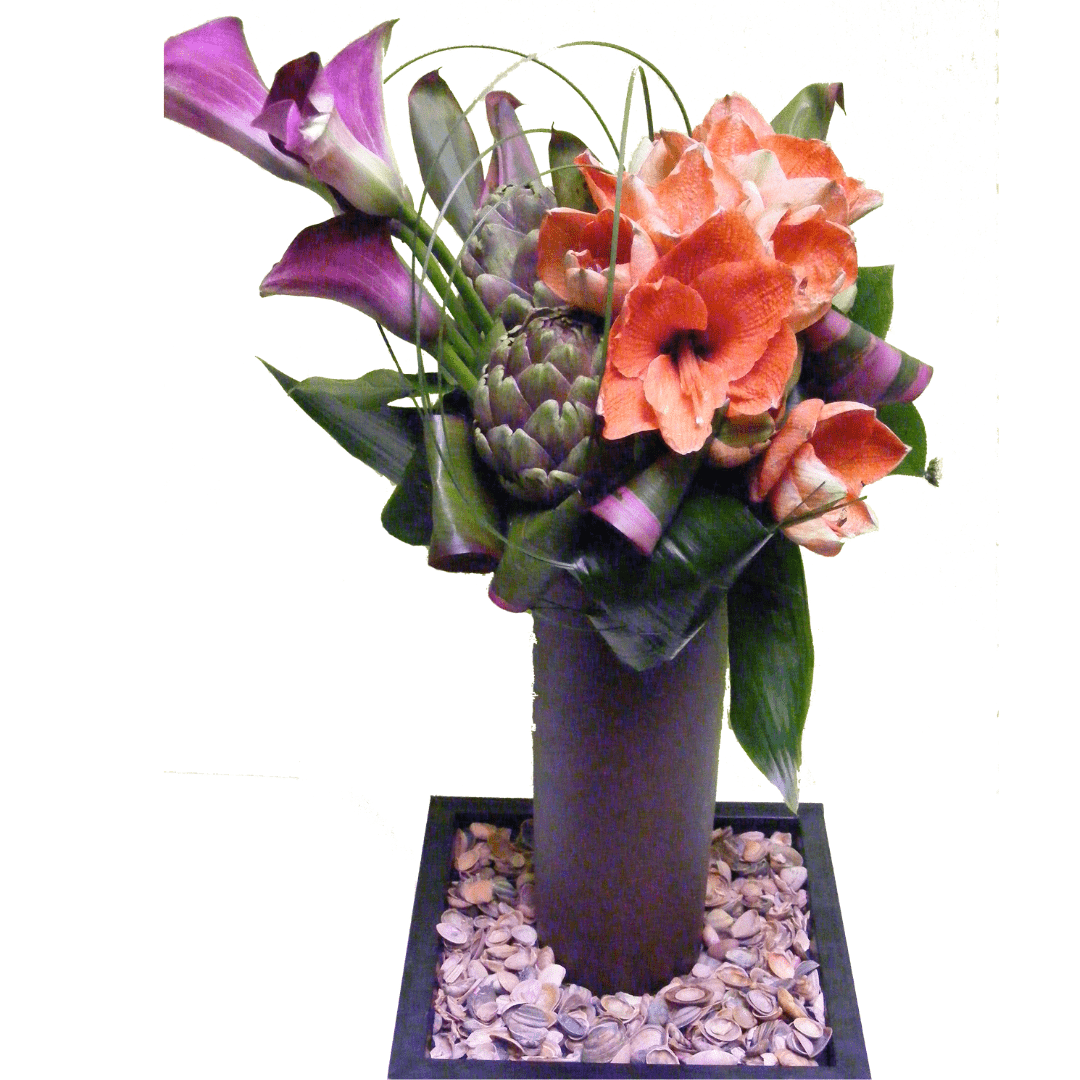 Beautiful modern Vase designed with Artichoke, Callas and Amaryllis. Medium pictured.