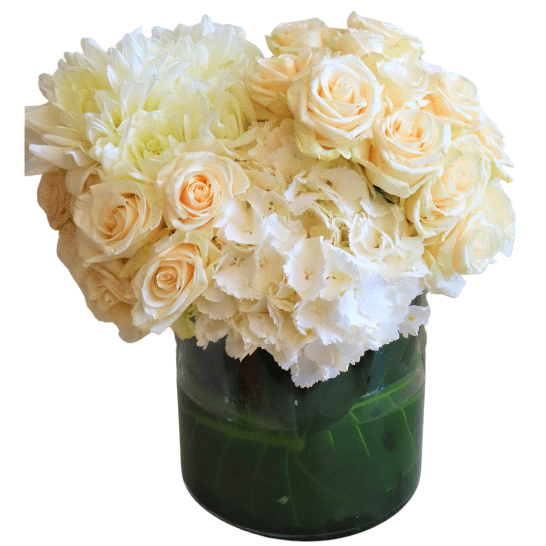 This beautiful compact vase arrangement is designed with hydrangeas, roses, and mums. Medium pictured.