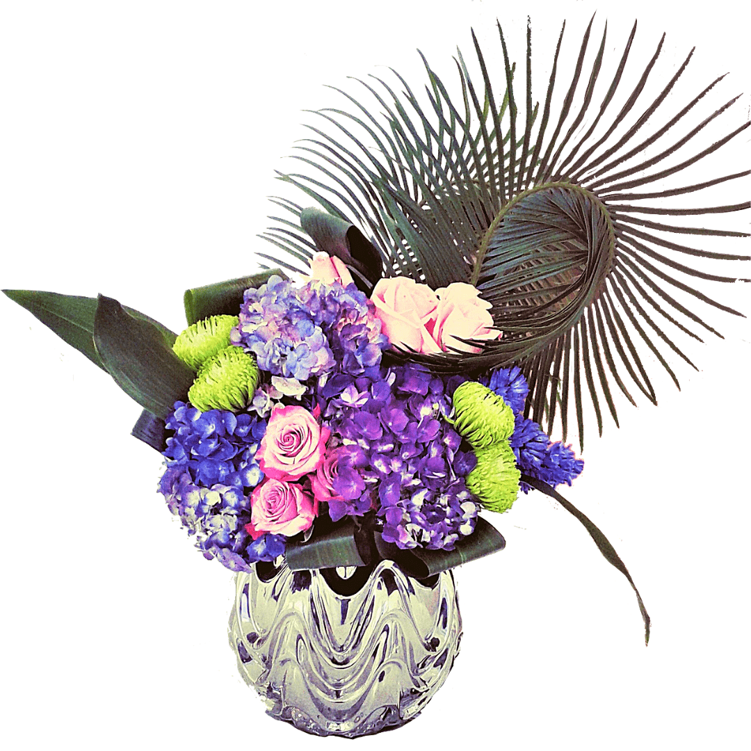 Lush vase arrangement designed with Fugi, Rose and Hydrangeas. Large pictured.