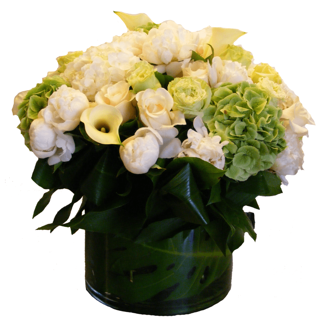 Beautiful vase arrangement designed with Hydrangea, Roses, Callas and Peonies. Large pictured.