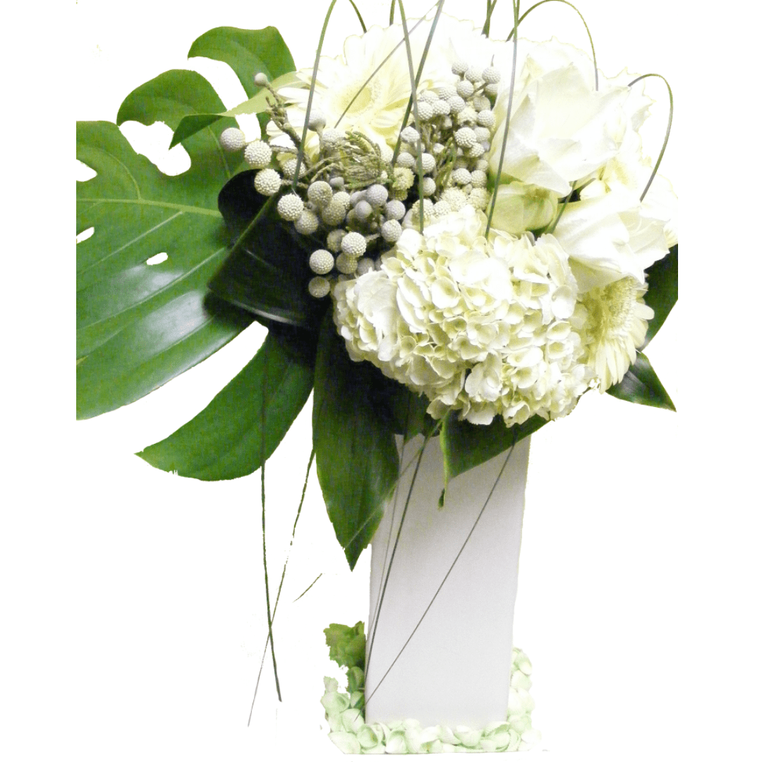 Beautiful modern Vase designed with Hydrangea, Bronia, Amaryllis and Gerberas. Size medium pictured.