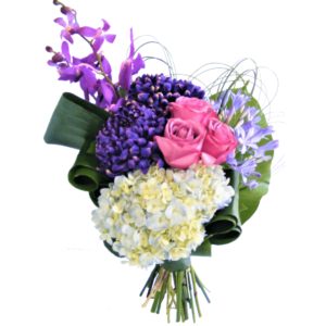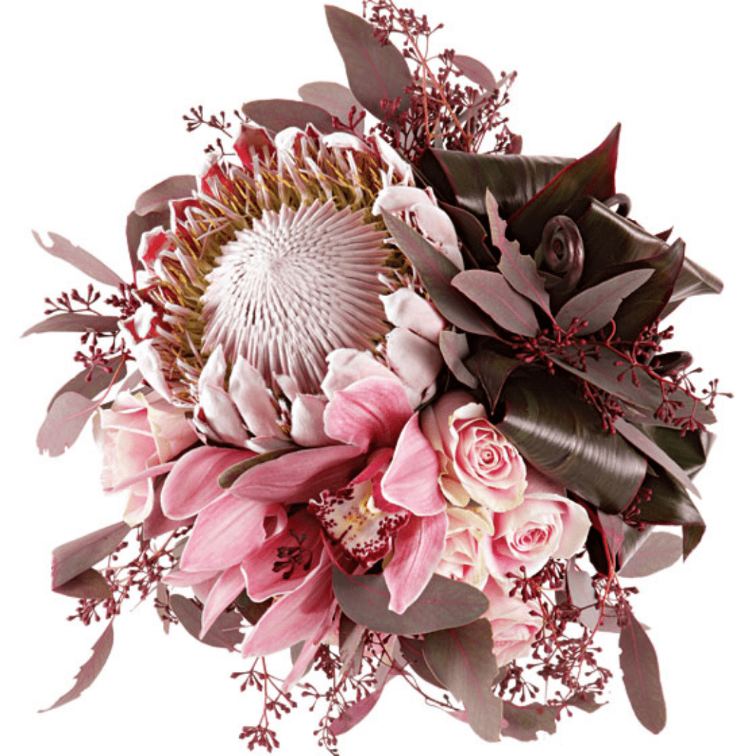 Beautiful modern bouquet designed with Orchids, Proteas and Roses. Large pictured.