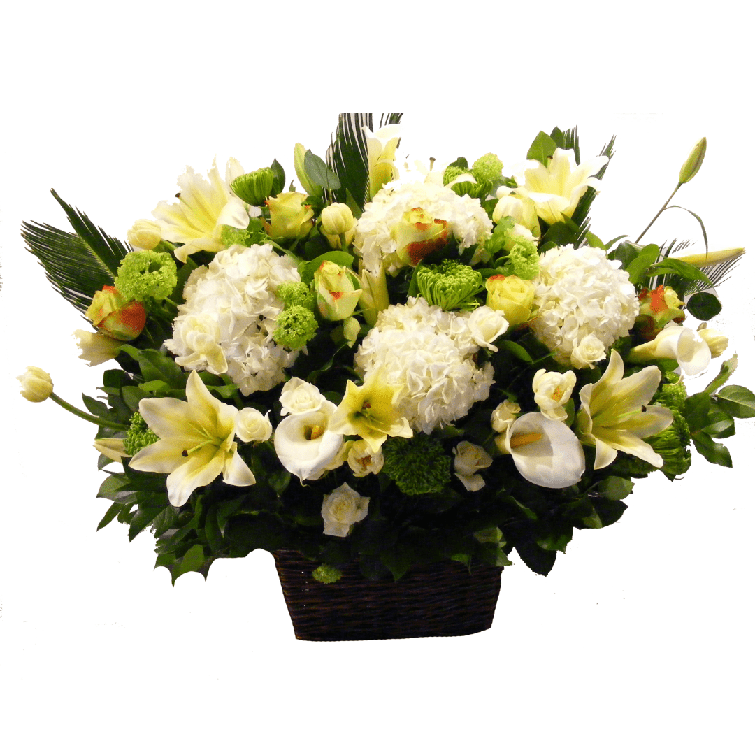Beautiful basket designed with Hydrangeas, Fugi mums, Tulips Calla and Roses. Medium pictured.