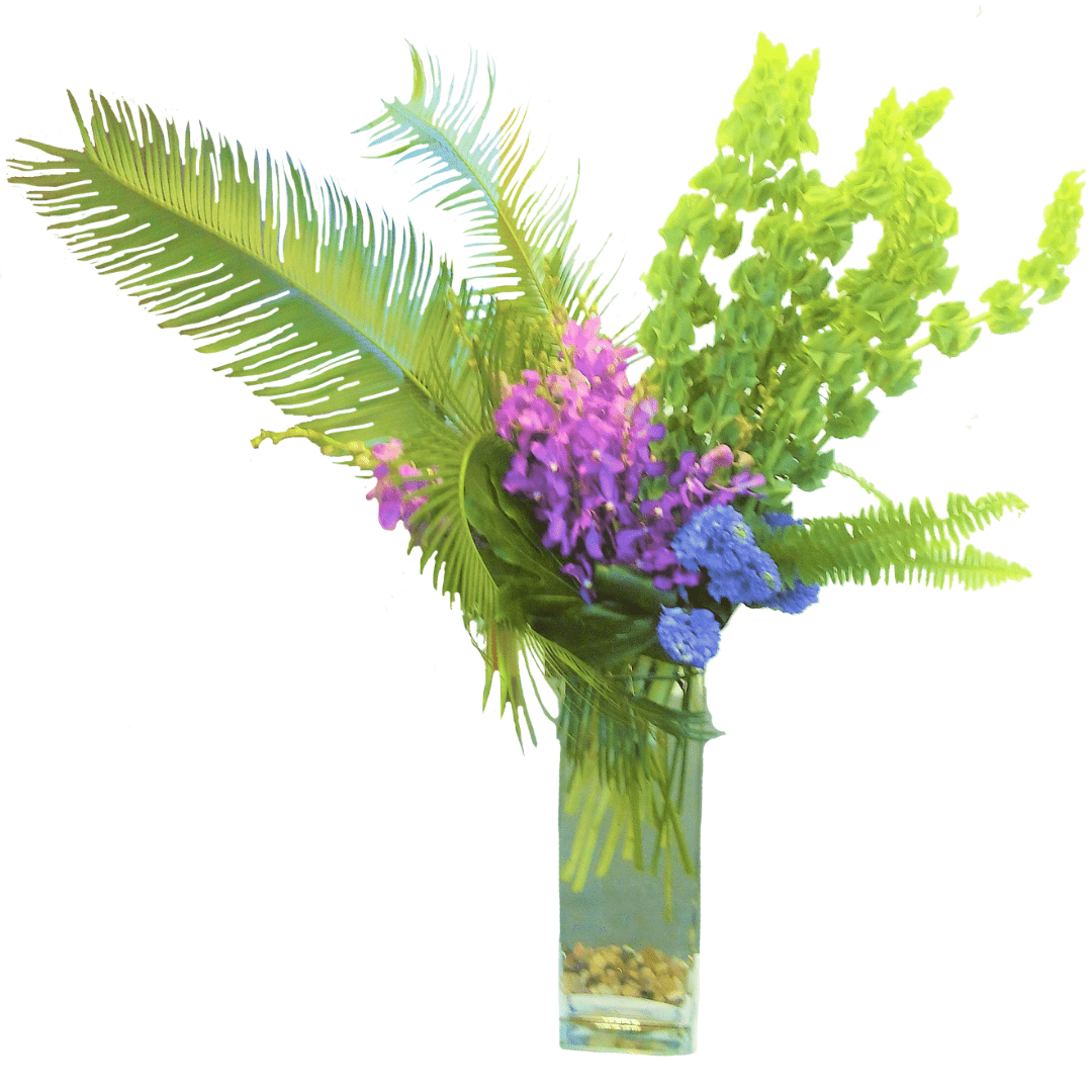 Beautiful modern Vase designed with Bells of Ireland, Hyacinths, and Orchids. Medium pictured.