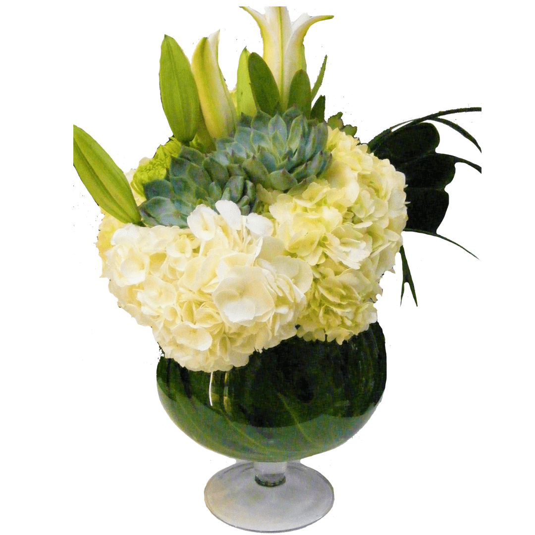 Beautiful vase arrangement designed with Hydrangea, lilies, Fugi mums and Succulents. Large pictured.