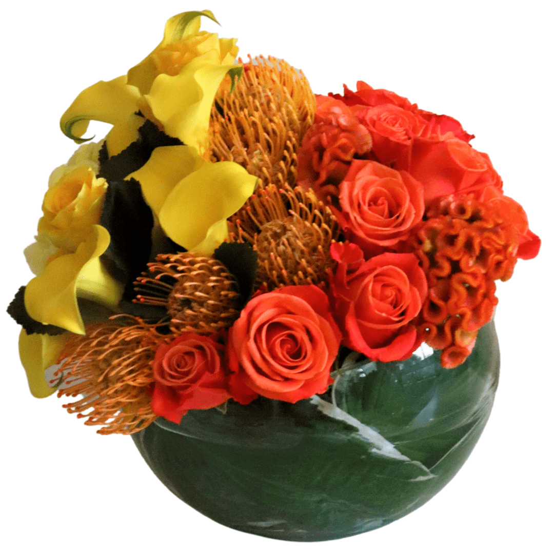 This beautiful compact vase arrangement is designed with Callas, hydrangeas, pincushions, and roses. Large pictured.